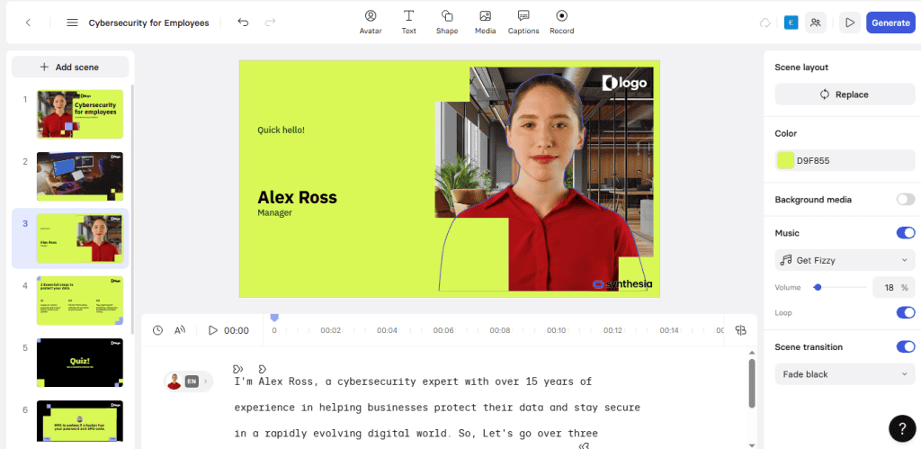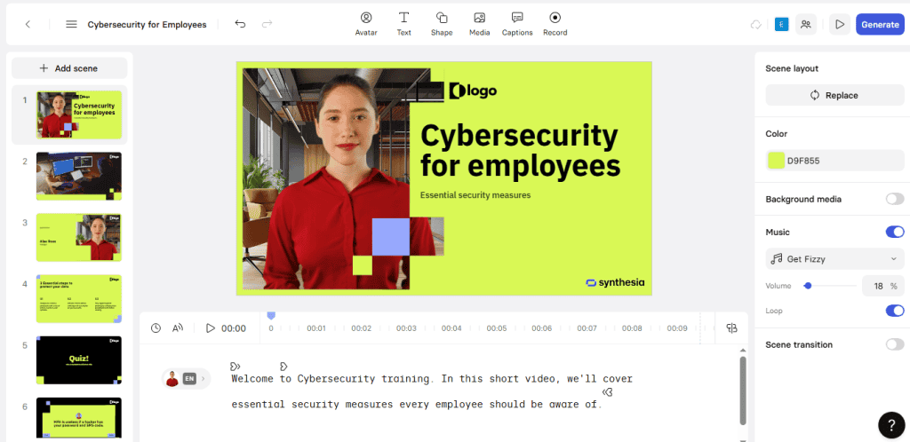 One of the most common applications of Synthesia is in employee training and development. Your company can replace lengthy documents, PowerPoint slides, or static PDFs with engaging AI-generated videos. This will be useful while onboarding new hires, delivering compliance training, or updating staff on new processes.
