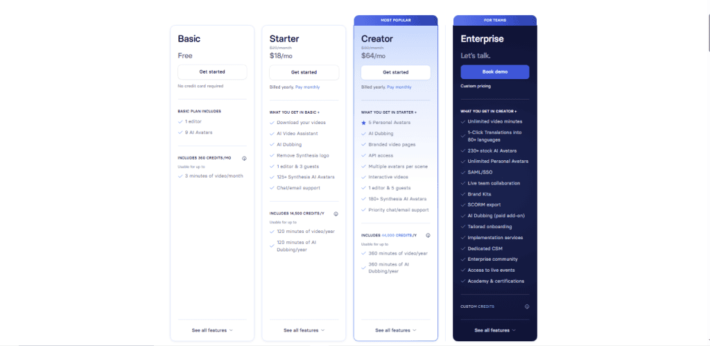 Synthesia’s flexible pricing plans come with different credits, avatars, and collaboration features.