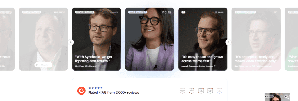 Synthesia has built a strong reputation among users, earning a 4.7 out of 5 rating from more than 2,000 verified reviews on G2.